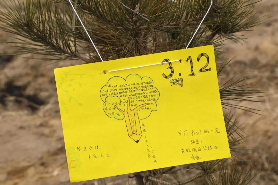种植一份希望,梦想一片未来。以班级为单位,每班的学生把写有寄语的心愿卡系在了自己栽种的松树上。从学生微笑的脸庞上,我们能感受到他们满满的喜悦和成就感。